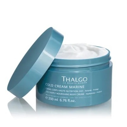 Hĺbkovo výživný telový krém 24h Thalgo z radu Cold Cream Marine pôsobí ako balzam prvej pomoci. Upokojuje, napravuje a dopĺňa lipidy do pleti. Je vhodný predovšetkým na suchú a citlivú pokožku. Chráni pokožku a poskytuje jej 24-hodinovú hydratáciu a výživu. Jeho textúra napodobňuje pokožku na lepšie vstrebávanie aktívnych látok. Nezanecháva mastný alebo lepivý film.